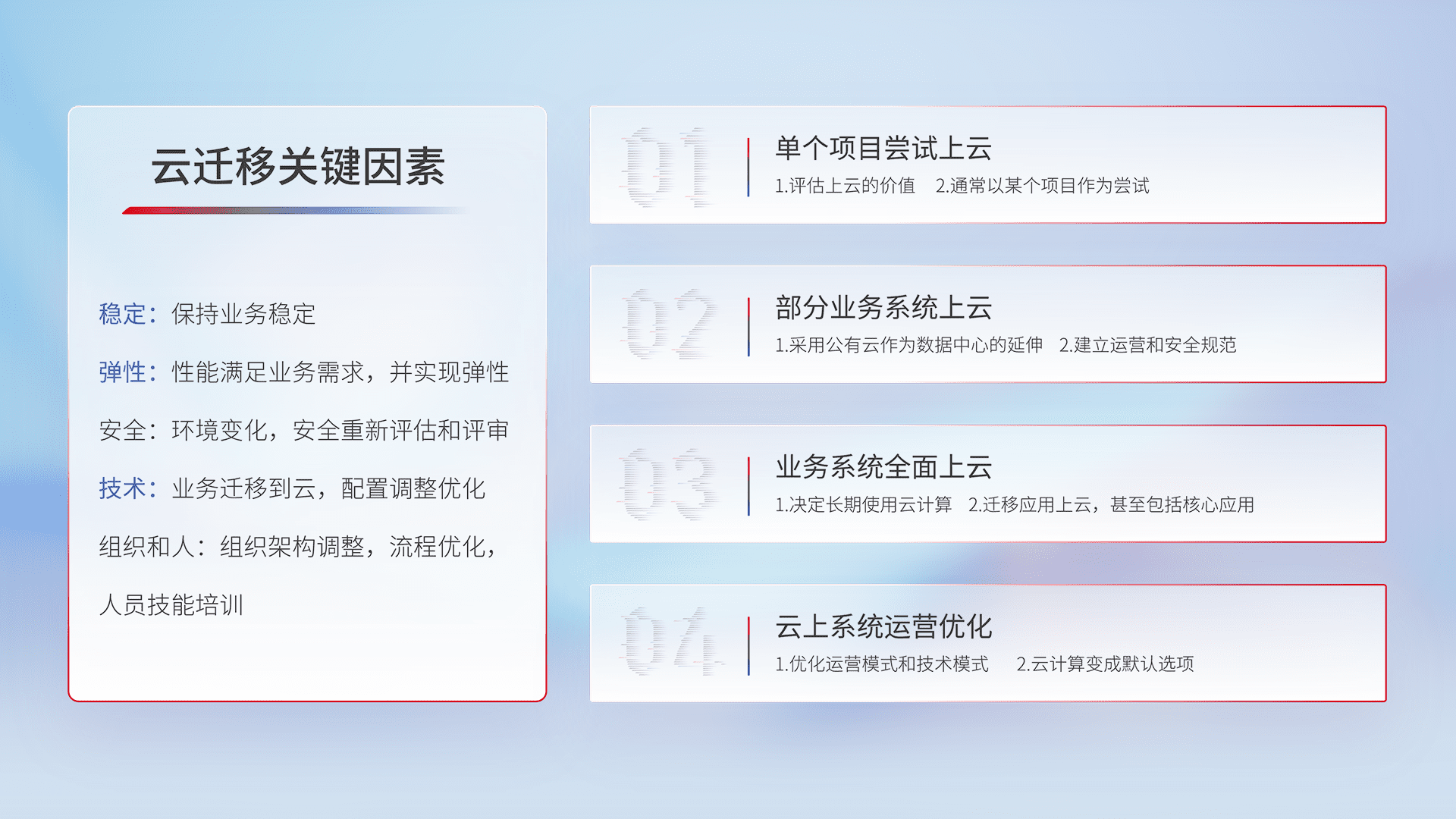 结合实际业务,,从规划设计、、、、云平台选型、、云原生改造、、、、数据迁移、、、、集成交付,,迁移全过程为客户识别最佳上云路径,,做好风险识别管理,,,,设计网络架构、、、身份权限、、、、安全审计合规、、、操作审计、、、日志审计、、监控告警策略、、、多站点容灾设计等,,对云上基础设施进行整体规划,,提升IT治理水平,,,,以满足弹性、、、、高可用、、高性能的需求。。。