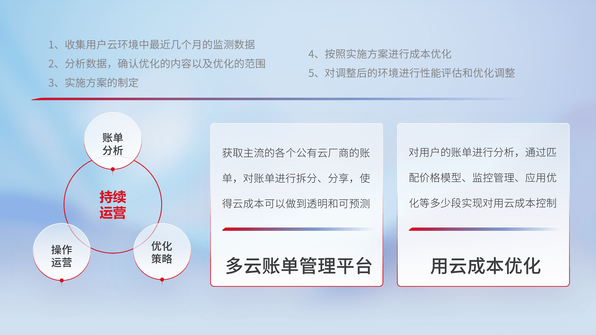 通过多云纳管,,,,以统一的资源数据模型把客户的云资源进行抽象和封装,,进而实现对多云资源的统一操作,,保障云资源管理的可靠性、、、、稳定性与可用性。。量身定制化运维内容,,,,配置、、开发运维、、、补丁管理、、、备份、、监控、、、、认证和访问管理、、审计和日常巡检等,,,保障在用云过程中的可靠度,,,,稳定度以及高可用率。。。。