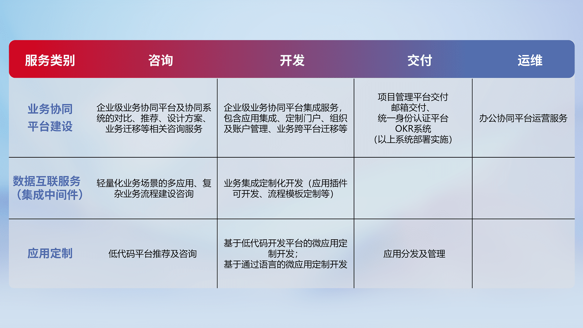 针对钉钉、、企微、、IDaas等平台级产品提供产品的规划、、方案、、、交付、、、、定制化开发等服务,,实现如统一协同办公、、智能客户服务、、混合会议管理、、、、智能数据查询、、等业务场景,,实现数字化转型。。